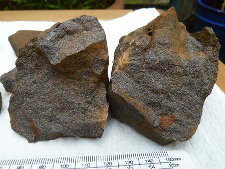 Photo 2. A piece of ironstone seen on the surface of a field at Paddlesworth (scale in mm).
