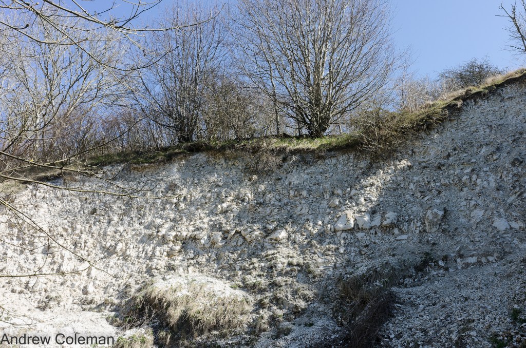 Unless you “get your eye in”, there aren’t many landscape features which can be related to characteristics of the Chalk Formations along this section of the walk, so the geology may be difficult to relate to the landscape. But the sides of the valley around Elham do show a change in slope which relates to the underlying geology. The New Pit Chalk Formation, which overlies the Hollywell Nodular Chalk Formation, forms the lower, steepest part of the slope. The Lewes Nodular Chalk Formation underlies the top part of the slope and the boundary is marked by a reduction in gradient (Aldiss et al., 2012).