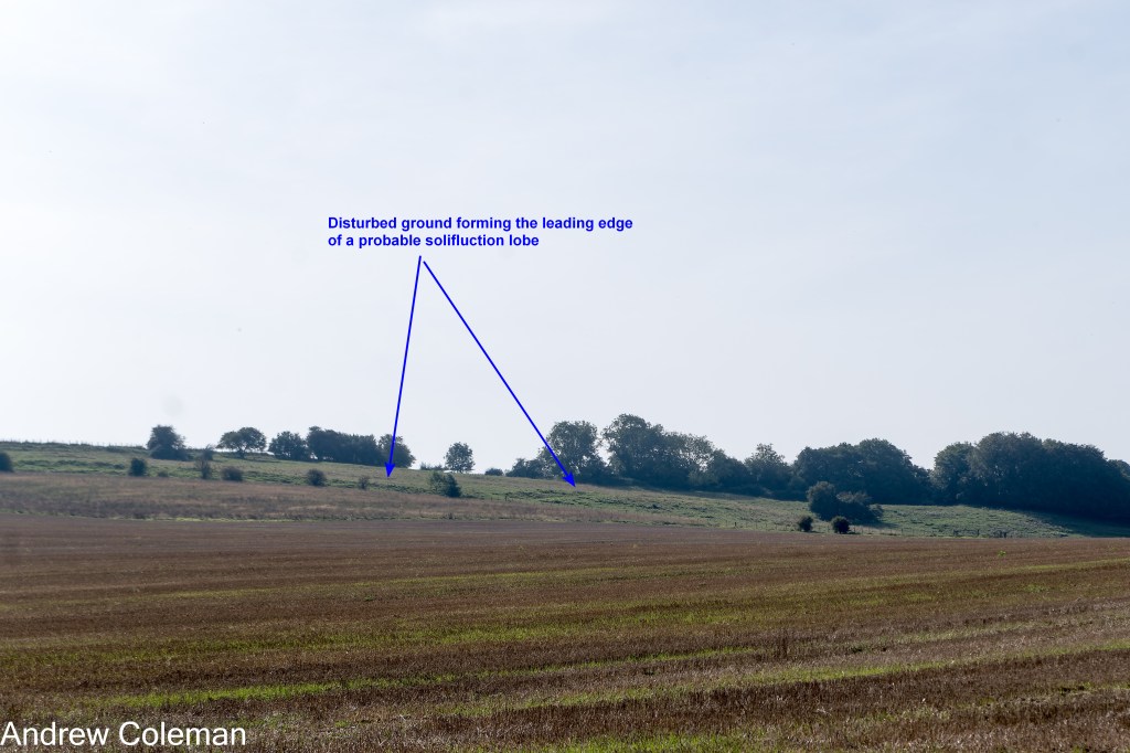 There are features on this slope further north along the valley, which are less marked but with a form more typical of solifluction lobes (Photo 9). These coincide with the edge of the mapped Clay-with-Flints outcrop which is a deposit which would be susceptible to solifluction.